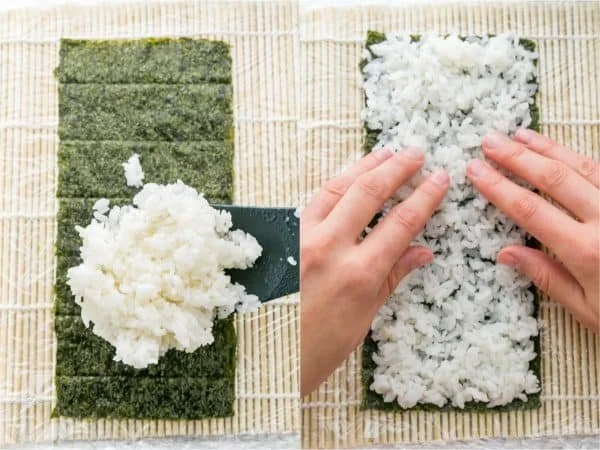 Spread Rice: Spread rice on 1/2 sheet of nori using wet fingertips (it helps to prevent sticking).